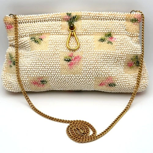 Bolso de mano floral con cuentas luminosas de los años 50 con correa de cadena dorada hecho en EE. UU. De colección