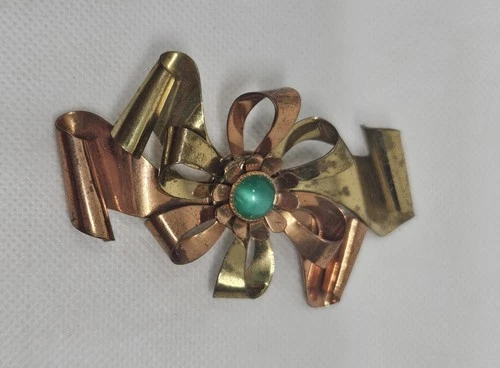 Broche de arco de cinta de latón cobre vintage de los años 40 cabujón verde prendedor retro de 3"