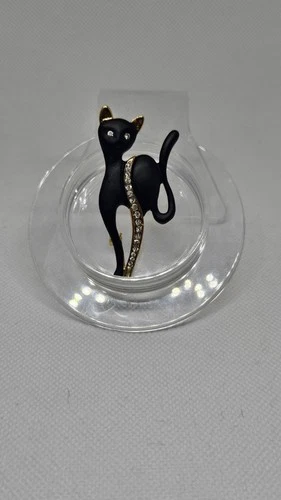 Broche prendedor de diamantes de imitación de gato negro esmalte mate tono dorado 2" Halloween vintage