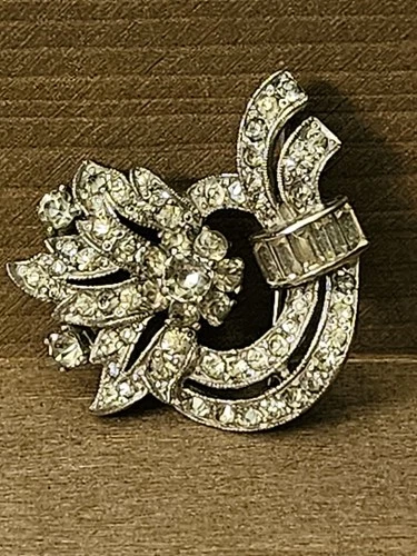 Broche Vintage Diamantes de Imitación Tono Plata Floral Spray Baguette Disfraz Joyería Prendedor