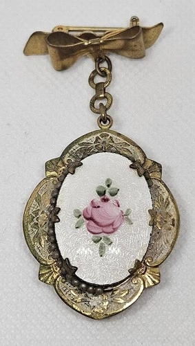 Broche colgante medallón rosa esmaltado guilloche vintage arco pin tono dorado años 40