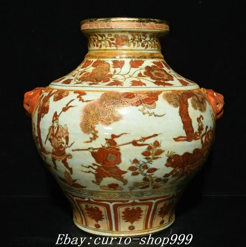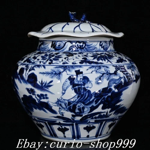 Tarro olla de barro hoja de loto caballo paseo gente porcelana blanco azul dinastía antigua de 13"