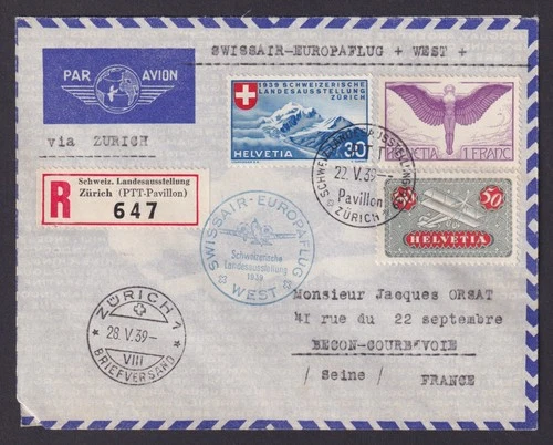 SUIZA 1939, Cubierta de correo aéreo registrado Swissair a Francia
