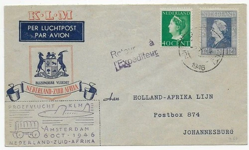 KLM correo aéreo - correo aéreo: Ámsterdam - Sudáfrica - Johannesburgo, vuelta, 1946
