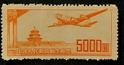 Sellos de viaje: estampillas de correo aéreo de China 1951 Scott #C3 - 5000 yuanes - como nuevas H NGAI