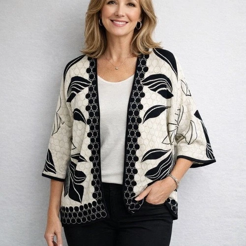 Cárdigan Mayerline Brussels Abierto Suéter L Negro Crema Botánico Jacquard Kimono