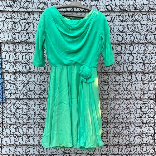 Vestido Miss Elliette verde crepé drapeado cuello redondo roseta flor cintura S/M
