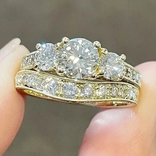 Conjunto de anillo de boda de diamantes simulados de corte redondo de 2 quilates para mujer enchapado en oro amarillo de 14 k