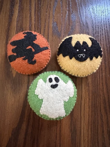 "3 mini almohadas de felpa redondas de fieltro de Halloween de 4"" murciélago fantasma bruja"