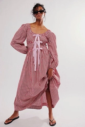 Vestido Damson Madder Dakota BowMidi EE. UU. 8 Rojo Guinga Midi Vestido con Cinta