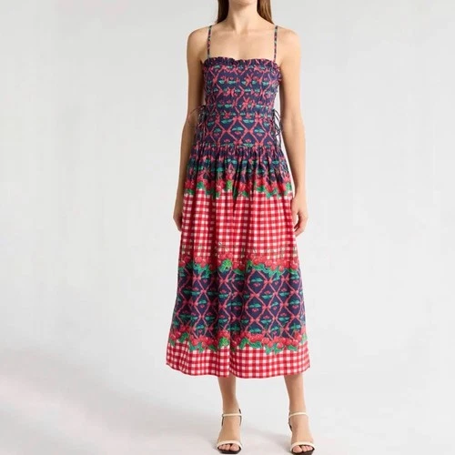 Vestido sin tirantes Damson Madder Kelia Cherry Pie Guinga Algodón Midi Talla 6 Nuevo con etiquetas