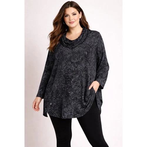 Top túnica Bryn Walker floral cuello capucha M brillante boho look por capas oscuro acogedor jersey