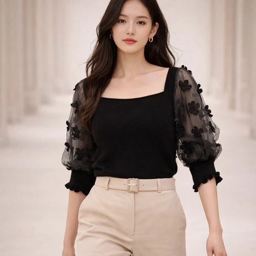Top tejido negro Sioni Milano manga abullonada transparente 3D gótico de hadas caprichoso acento floral