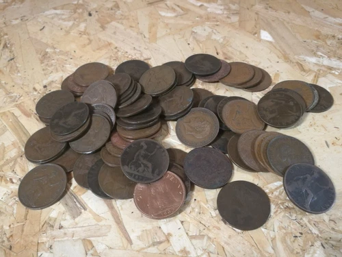 Lote de 75 monedas antiguas y vintage grandes de un centavo de metal Reino Unido Gran Bretaña