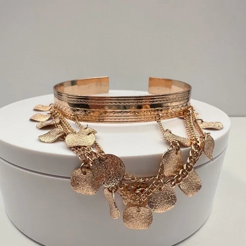 Brazalete brazalete vintage años 90 tono dorado boho en capas con dije de moneda grabado declaración