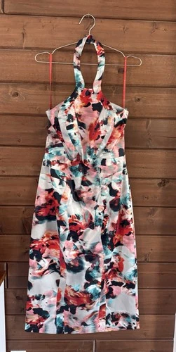 Vestido midi MONIQUE LHUILLIER floral halter malla trasera funda cóctel talla 12