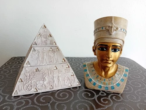 Adorno Busto Neferti Egipcio 14,5 cm y Caja Baratija Pirámide 3 Niveles 13,5 cm