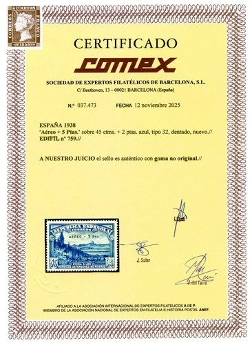 ✔️ ★ EDIFIL 759. 1938 - DEFENSA DE MADRID AEREO+5 Pts CERTIFICADO COMEX (+450€)★