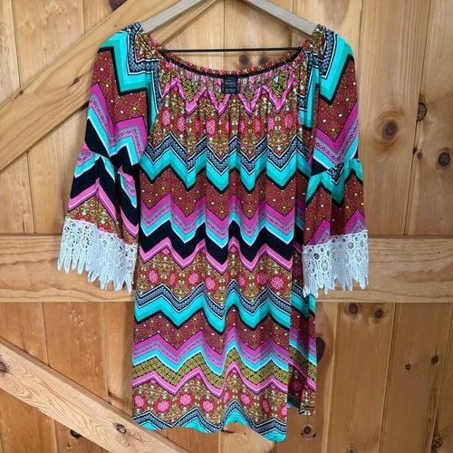 Top túnica WinWin rosa turquesa chevron encaje ribete media manga boho festival L-XL