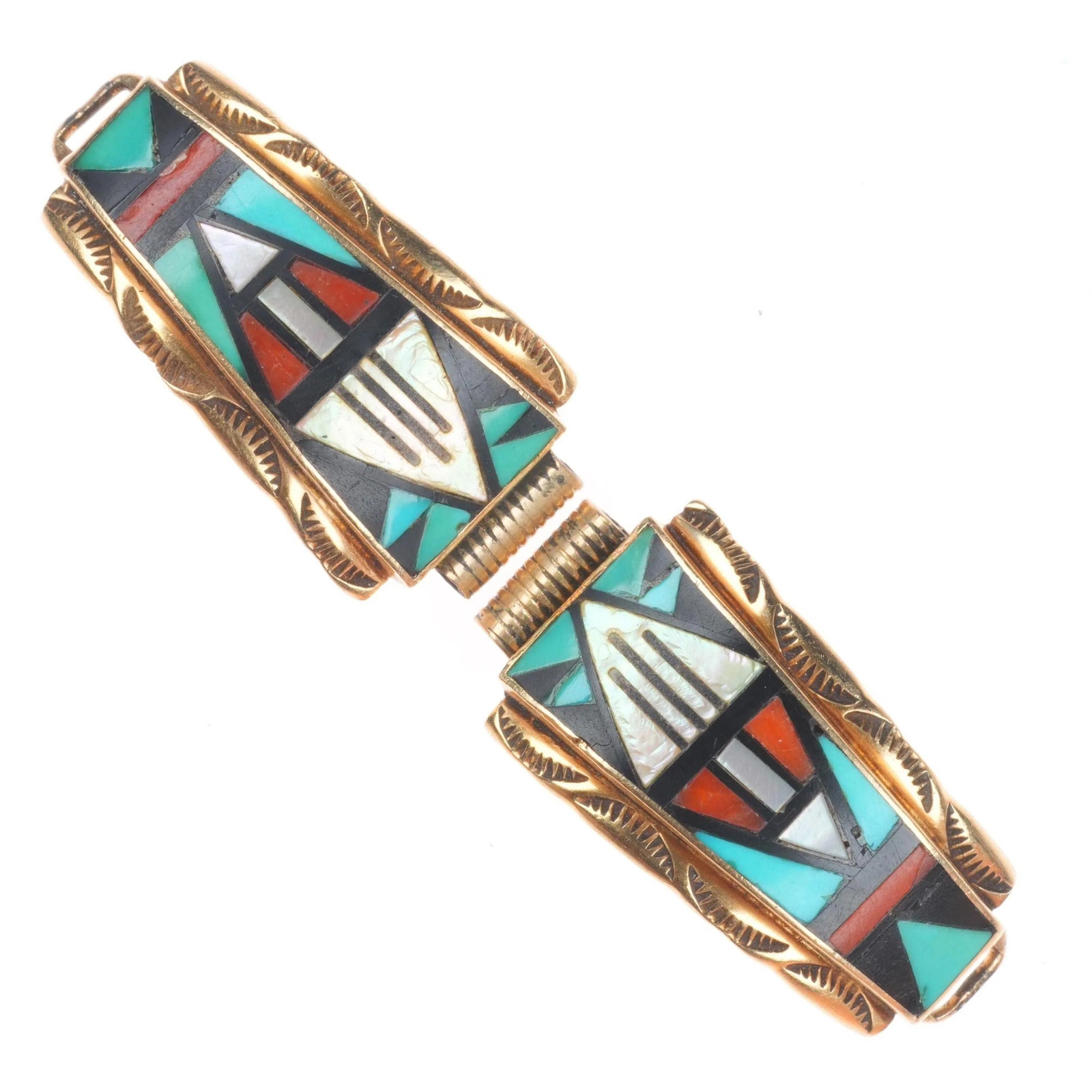 Nelson Walley vintage Zuni inlaid 14k gold ladies watch tips turquoise/coral