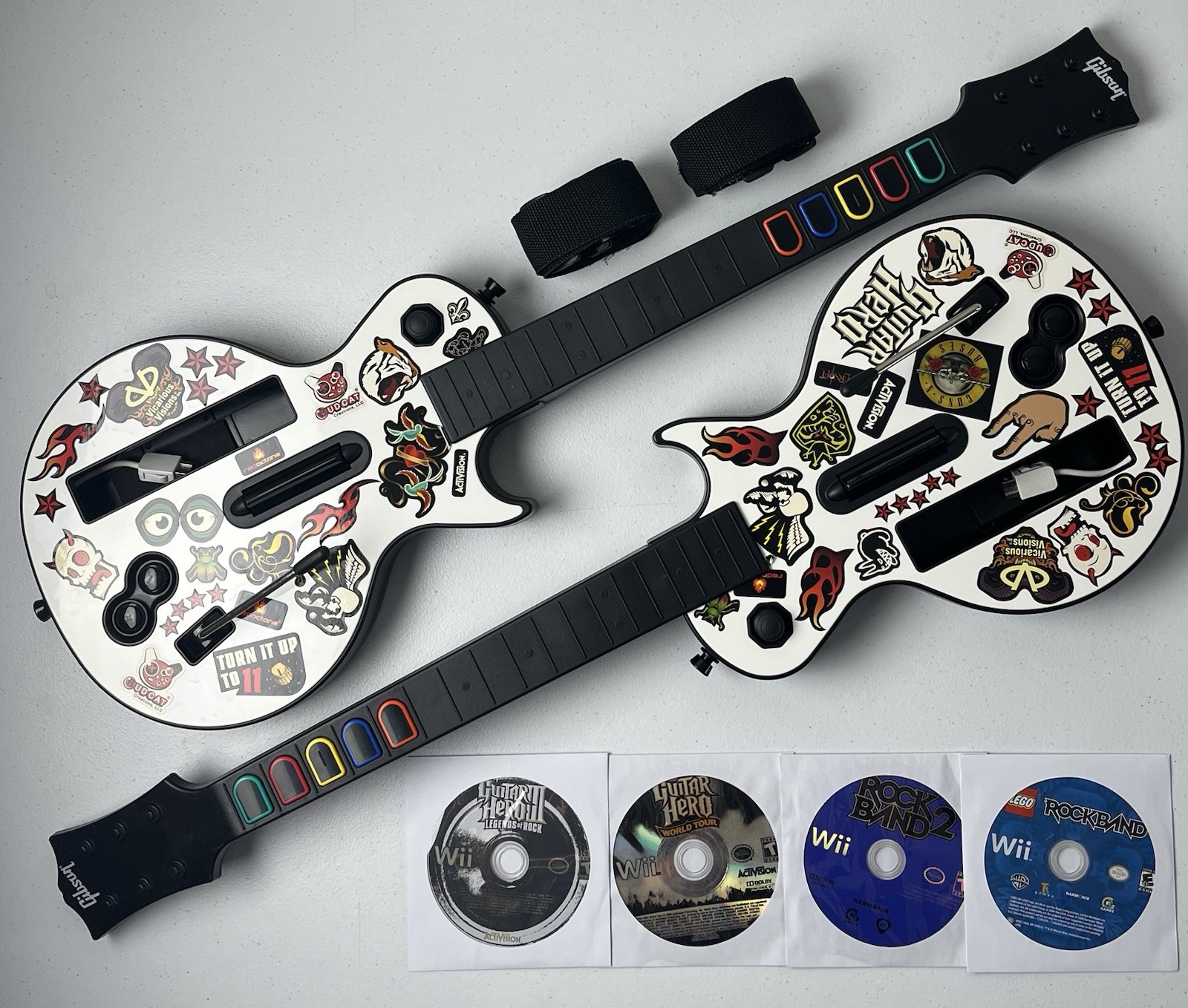 Nintendo Wii Guitar Hero Legends of Rock Bundle w/ 4 Games Dual Guitar GH3 Lot