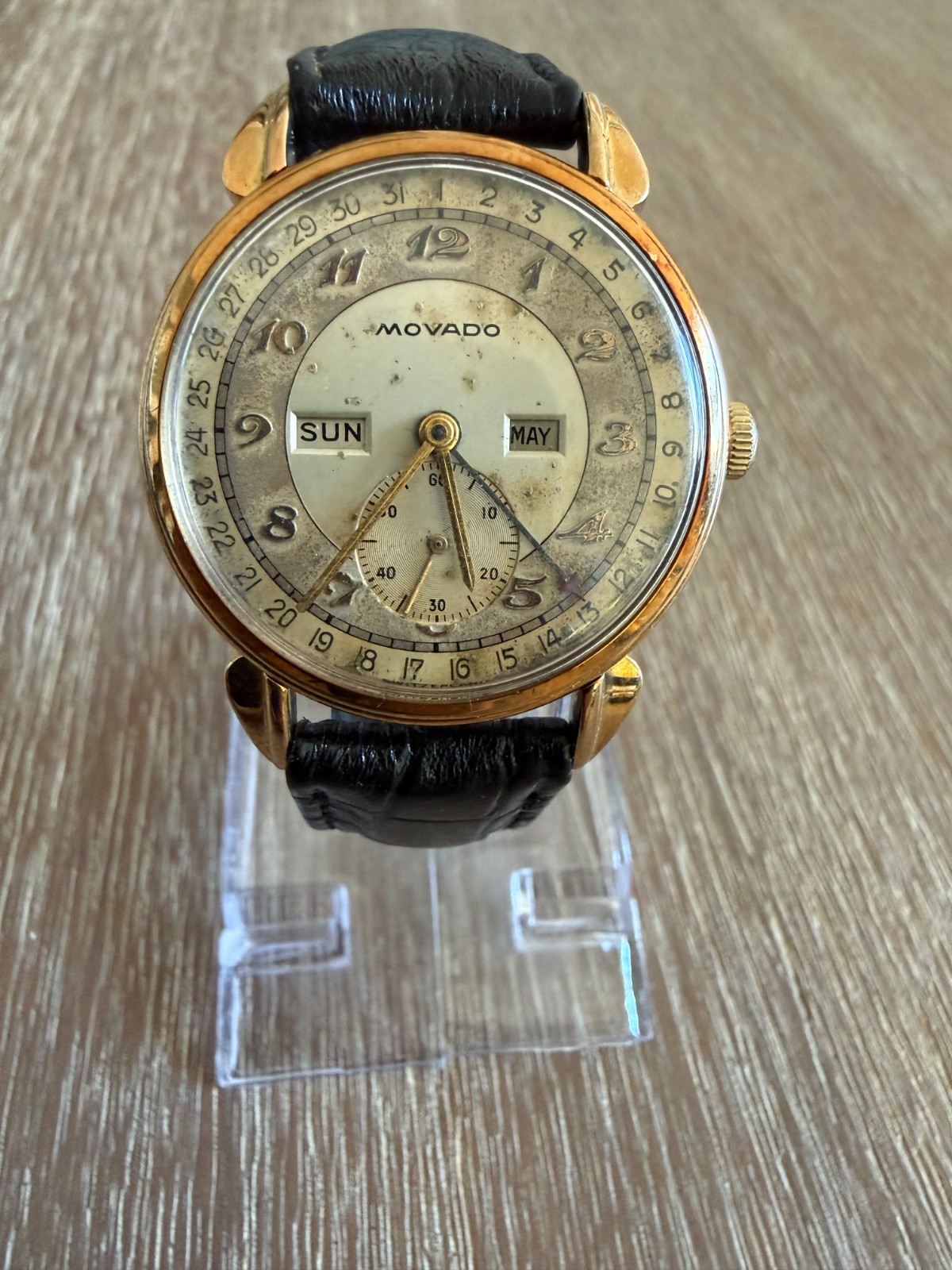 Vintage MOVADO Triple Calendar Watch 14K pink gold, tear drop lugs fluted case