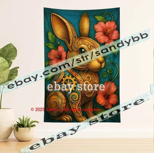 Steampunk Rabbit Tapestry 3D Effect Fantasy Art floral gear 39X59 in