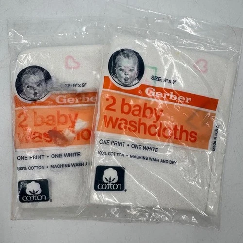 Vintage Gerber 2 Baby Washcloths 1 Print 1 White 100 Cotton Soft Absorbent NOS