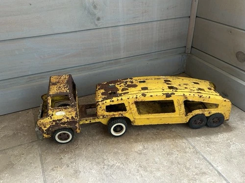 Vintage Metal Yellow Pressed Steel Car Hauler Carrier Trailer.