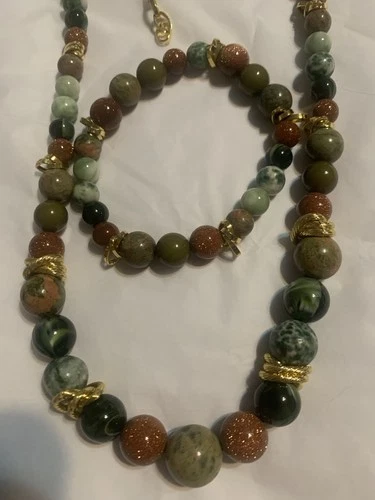 Vintage New W/Box Liz Claiborne Green Unakite Glass Bead Necklace & Bracelet Set