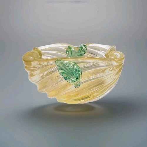 Vintage Murano Barovier Toso Gold Poliveri & Green Leaves Vase Bowl Italy