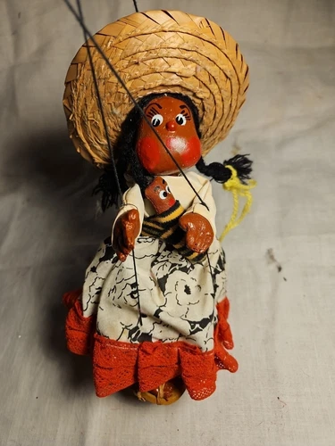 Vintage Marionette Doll Straw Hat Dress w/ Sandals & Baby