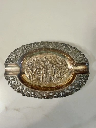 Antique Ornate Victorian Dutch Street Scene Repoussé Silver Plated Ashtray c1895