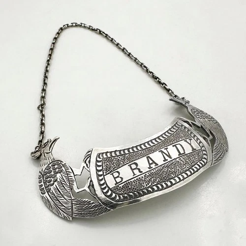 ANTIQUE BRANDY DECANTER LABEL BIRDS SILVER PLATE Unmarked