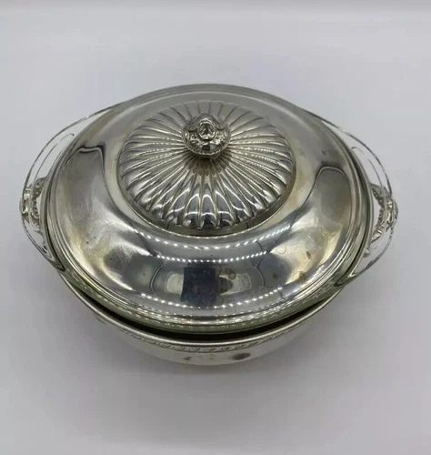 VINTAGE 3 PIECE SILVER PLATED SERVING BOWL W/ LID 1.5 QT PYREX Pilgrim Silver