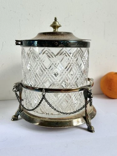 Antique Silver Plated Crystal cute glass Biscuit Box Barrel Stand griffins