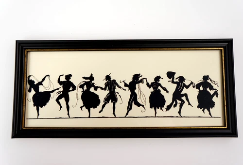 Enchanting silhouette: "The Dance of Fools" as print, framed 26x12cm. (G15)