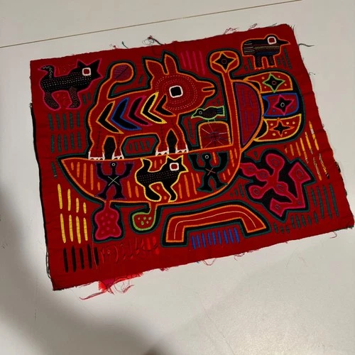 Mola Art Panel Red Animal Boat Folk Art Textile Wall Hanging