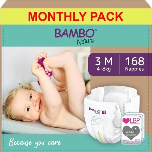 Bambo Nature Premium Eco Nappies, Size 3 (9-18lb/4-8kg), Midi 168PK Eco-Labelled