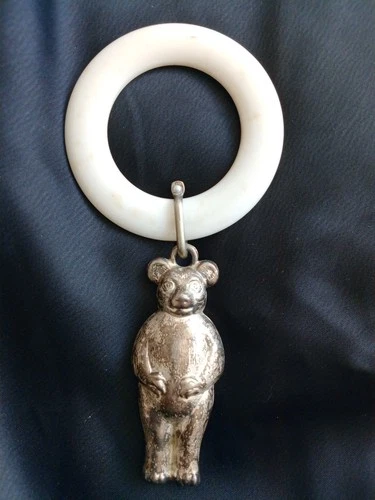 Antique Silver Teddy Bear Rattle Teething Ring Christening