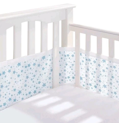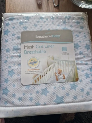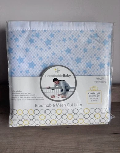 BNIB Breathable Mesh Cot Liner White, Blue Stars. Hypoallergenic, Washable, Safe