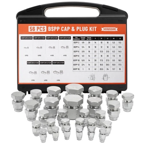 Venussar 56 Pcs BSPP Cap and Plug Kit, Hydraulic 02/04/06/08/10/12/16