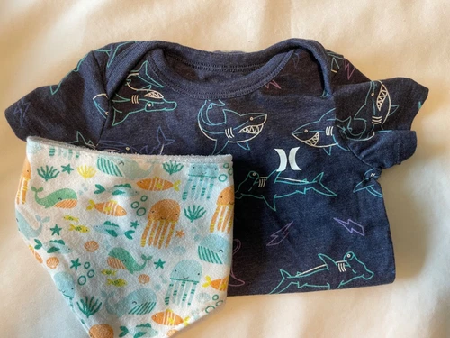 Hurley Baby Clothes One Piece Bodysuit Blue with Sharks and Bib Size 6 Months