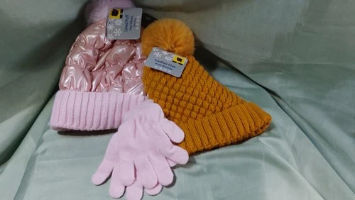 GIRLS' PINK & YELLOW WINTER ACCESSORY SET - 3 PIECES - BEANIE & GLOVES