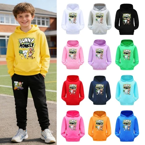 Boys Girls Bunny Vs Monkey Pocket Hoodies Kids Jumpers Sweatshirt Pullover Top