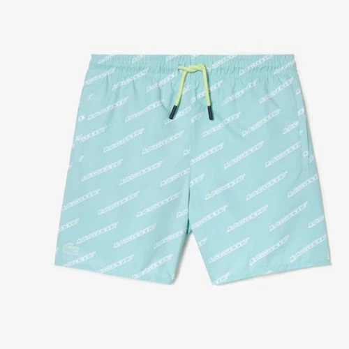 Lacoste Kids Swim Trunks Shorts Aqua All Over Logo Print Drawstring Size 12