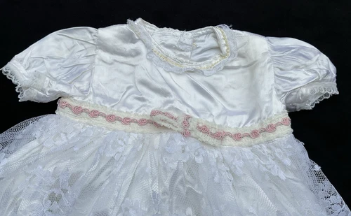 White Satin Floral Lace Baby Baptism/Christening Gown With Pink Lace Vintage