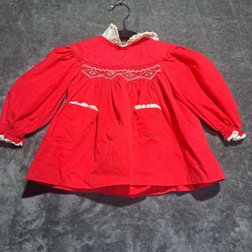 VTG Polly Flinders Red Smocked Dress Girls 12M Lace Collar Long Sleeve Pockets