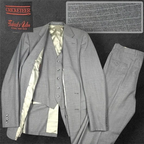 Vtg Cricketeer 3 Piece Suit Mens 42L Grey Wool Pinstripe Union Made USA Mobster