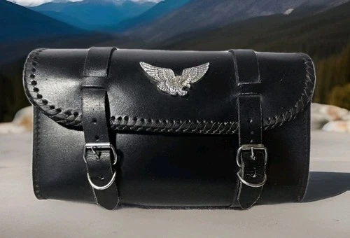 Vtg Black Leather Motorcycle Tool Pouch With Silver American Eagle 70s-80s Read
